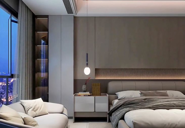 Modern Master Bedroom Design with King size Bed of Grey and silver colour Theme