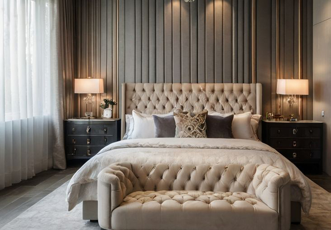 • Contemporary Master Bedroom Design with King Size Upholstered Bed & Back Panel