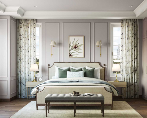Contemporary Master Bedroom Design with French Panel & Upholstered Back