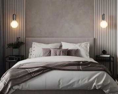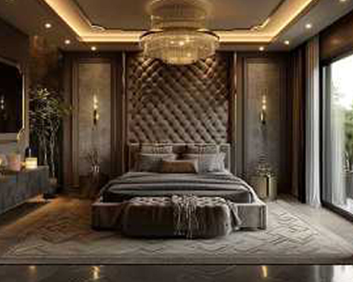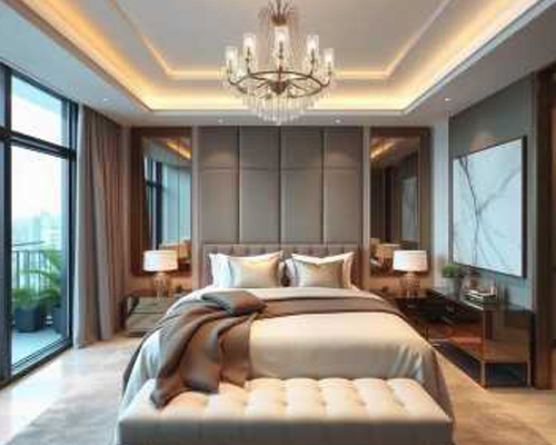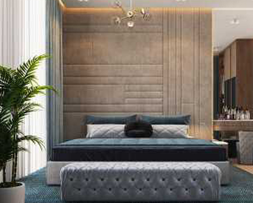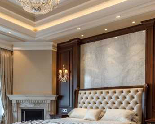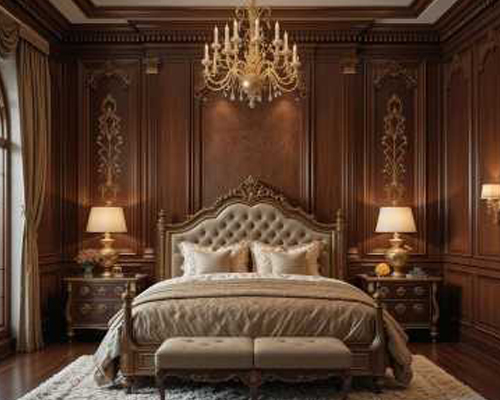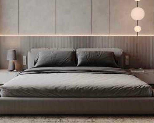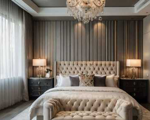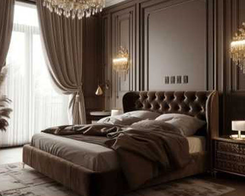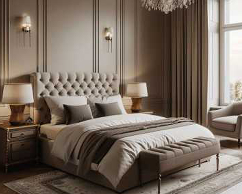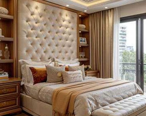 Classic Bedroom design with Upholstered bed's Back and Acrylic sheet in the back wood panel