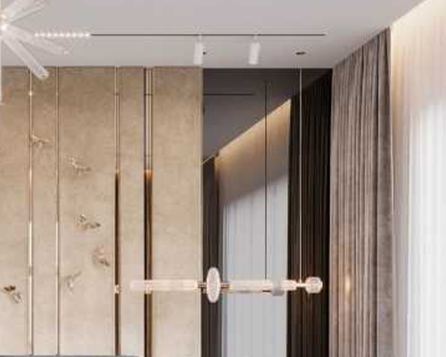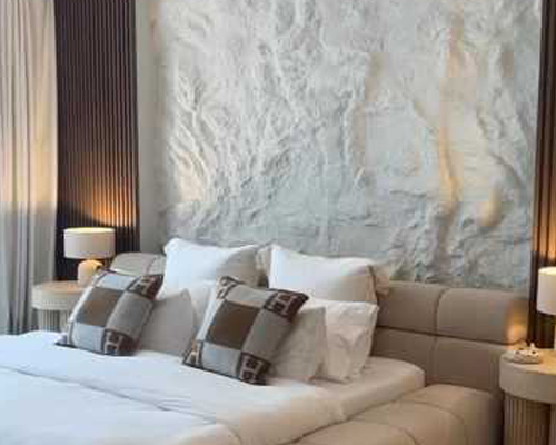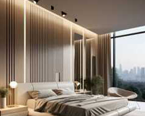 Contemporary Master Bedroom Design with Texture sheet and Wooden Louvers