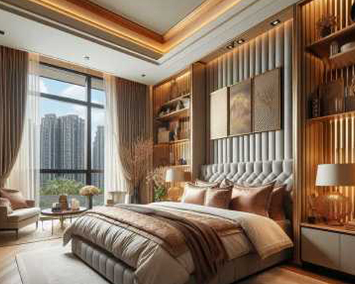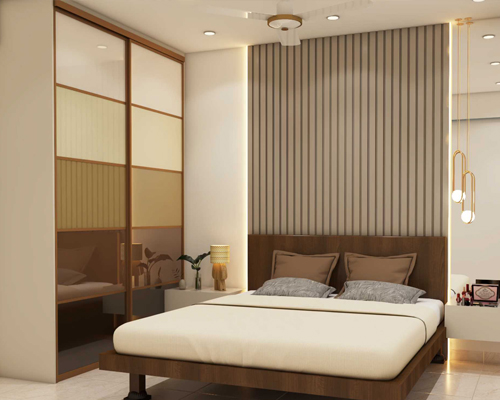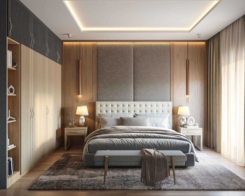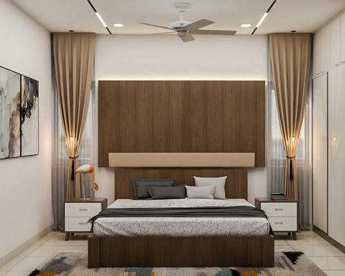 Contemporary Master Bedroom Design with Laminate Finish wood Panel