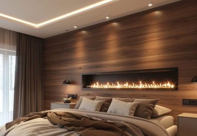 - A stylish and inviting space, this master bedroom showcases a wooden-framed bed with a plush brown upholstered headboard, elegant wall trims with wallpaper, and warm lighting.