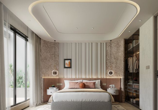 - A stylish and inviting space, this master bedroom showcases a wooden-framed bed with a plush brown upholstered headboard, elegant wall trims with wallpaper, and warm lighting.