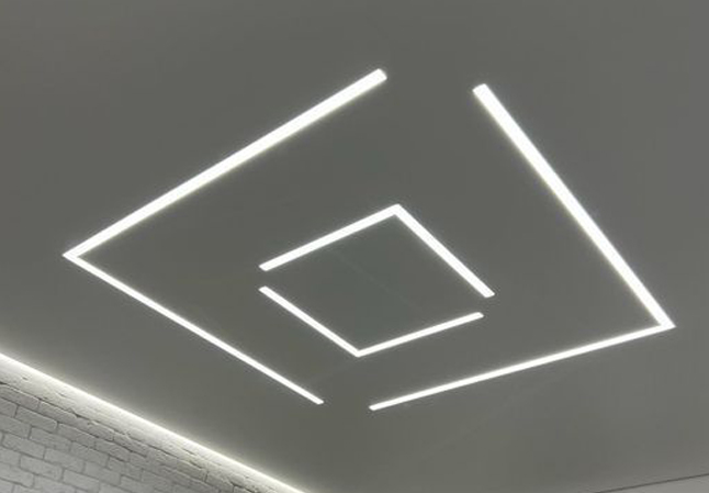 • False ceiling design with half cut square with integrated lights for Bedroom