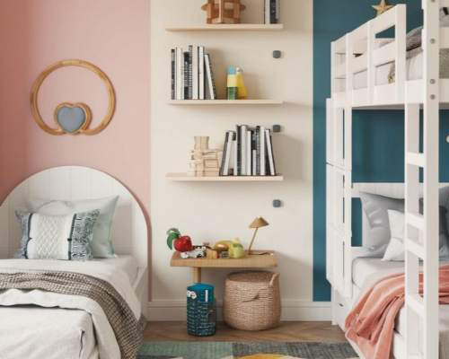 Kids Bedroom Design with Wood Bunk Bed & wallpaper in the background