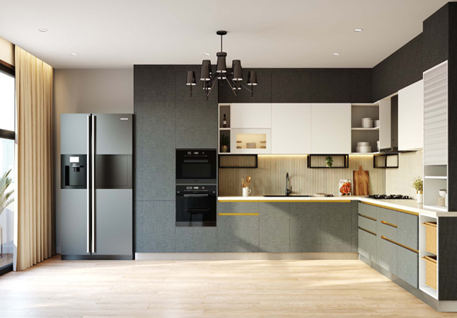 • Contemporary U-Shaped Kitchen Design with Suede Laminate Finish