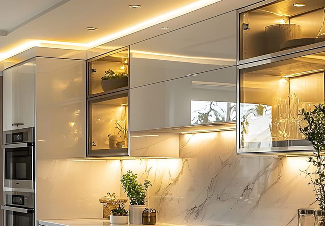 Straight Kitchen Design with Tinted Glass and Gloss laminate finish