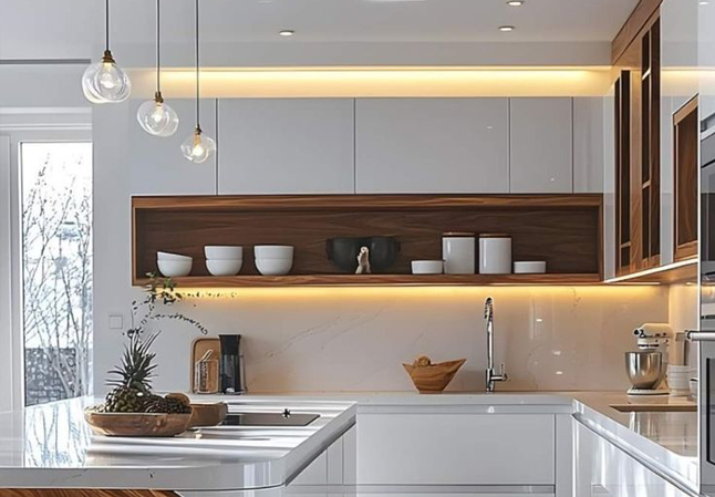 • Modern L-Shaped Kitchen Design with Island Deck, laminate Finish