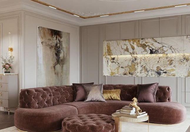 • Contemporary Living Room Design with Curved Sofa French Panel In Back Wall with Wallpaper