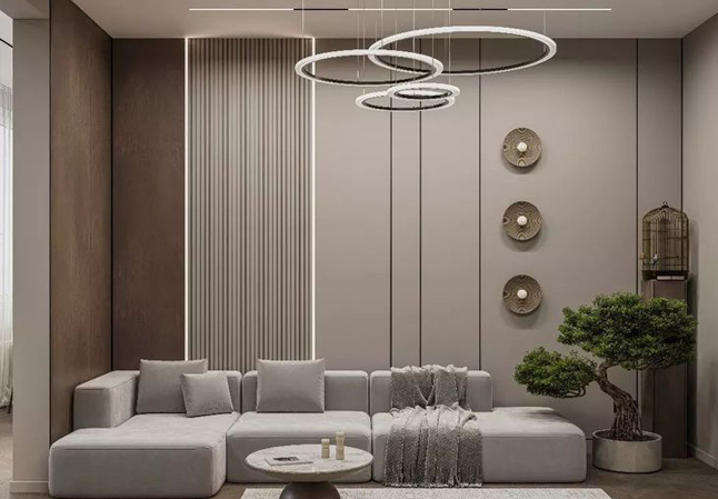 Contemporary Living Room Design with 5 seater Sofa and Grooved Wooden Panel in Matt Laminate finish