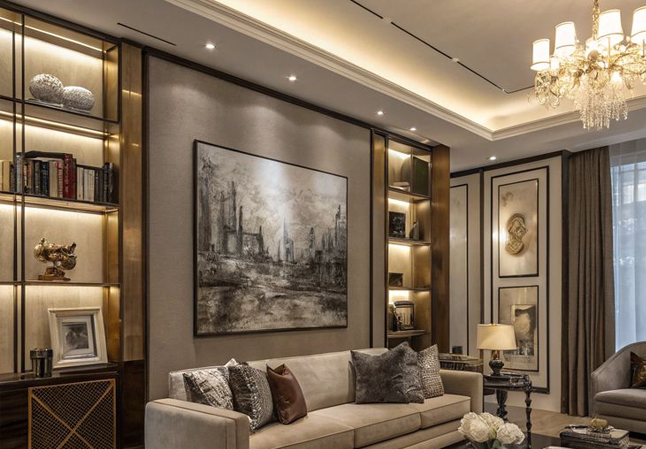 Modern Living Area design with display unit and Wooden Panel in Suede Laminate Finish