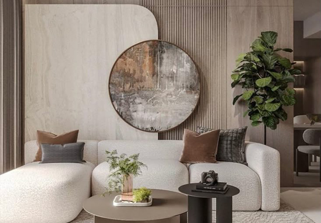 Modern Living area Design with White 5 Seater Sofa and Arched Wall Paneling