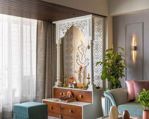 Modern White Pooja Unit with Ganesh ji carved on wooden structure