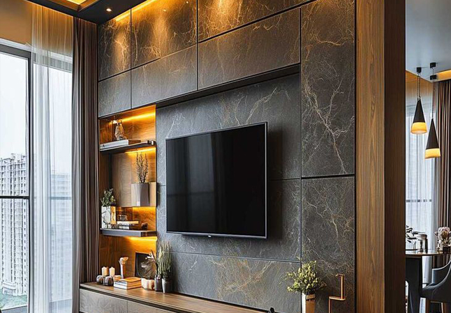 • Contemporary Tv unit design with Suede laminate Finish & display unit