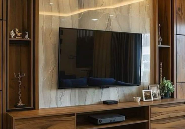 • Contemporary TV unit design with Acrylic Sheet, Drawers in Suede Laminate Finish