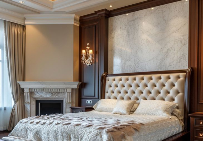 Classic Bedroom design with Upholstered bed's Back and Acrylic sheet in the back wood panel