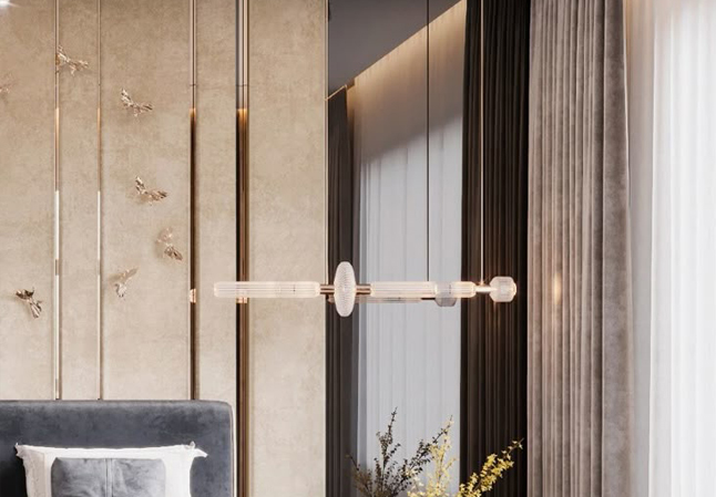 • Contemporary Master Bedroom Design with King-Size Bed & Back Panel with Glass Finish