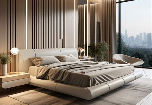 • Contemporary Master Bedroom Design with Sleek Wooden Wall Panel