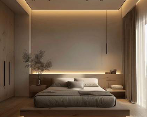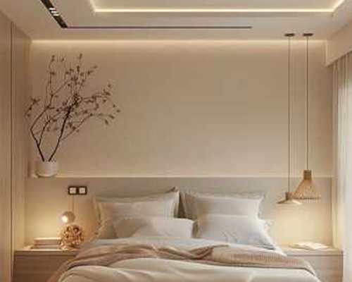 Contemporary Master Bedroom Design with Cream Fabricated Wall Panel
