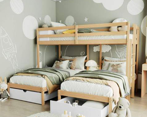 Kids Bedroom Design with Wood Bunk Bed & wallpaper in the background