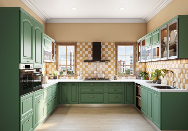 Contemporary U-Shaped Kitchen Design with Green Duco Paint Finish