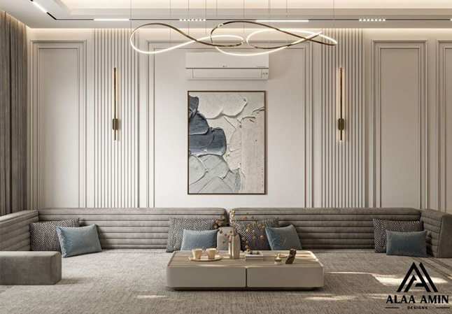 • Contemporary Living Room Design with Grey 8 Seater Sofa With Wallpaper