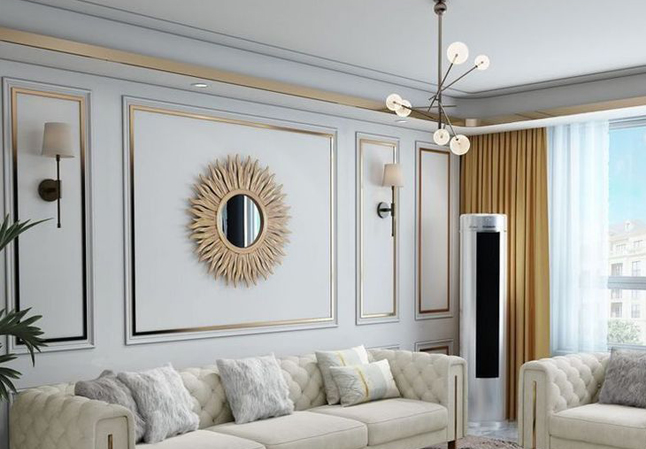 Contemporary Living Room Design with Grey 5 seater Sofa and French Panel in the back Wall