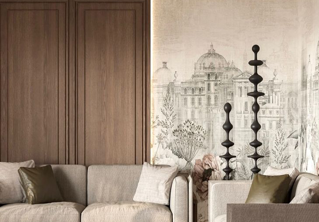 Modern Living area design with 4 seater Grey Sofa and wooden panel on the back wall
