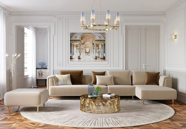 Contemporary Living Room Design with 5 seater Sofa and French Panel in the back Wall