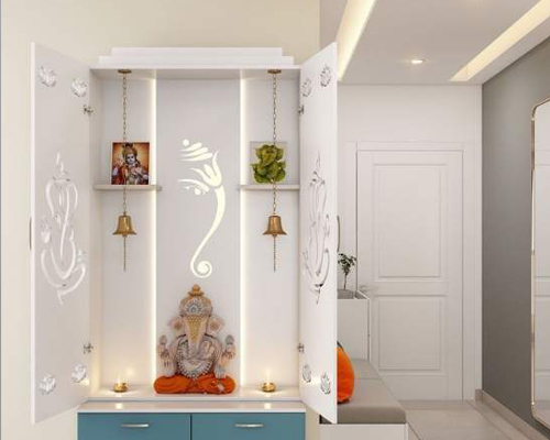Modern White Pooja Unit with Ganesh ji carved on wooden structure