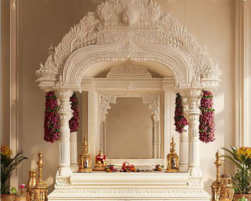 Traditional Mandir Design in Carved with Cement and Marble Finish