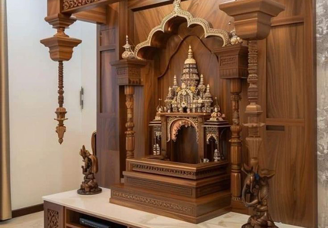 Traditional Mandir Design With Suede Laminates and marble Shelf