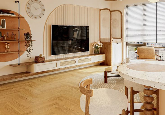 • Modern Living Area design with display unit and Arched Wall Trims