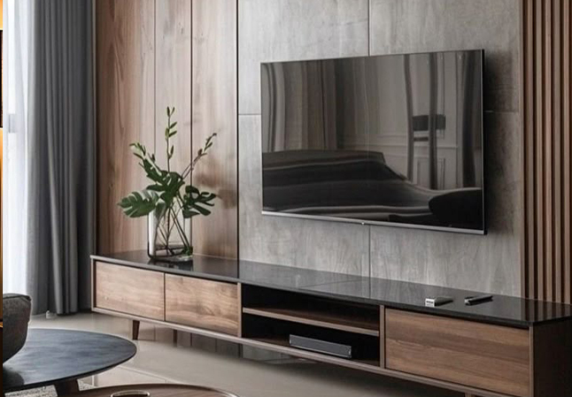 Modern TV Unit design with Wooden Louver and laminate finish