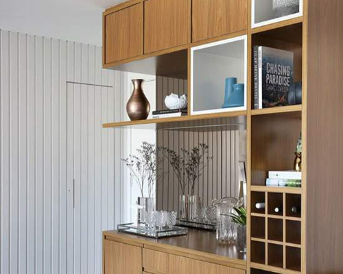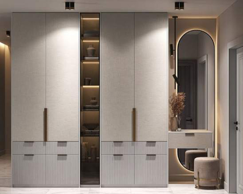 Contemporary Wardrobe Design with Suede Laminate Finish and Display unit